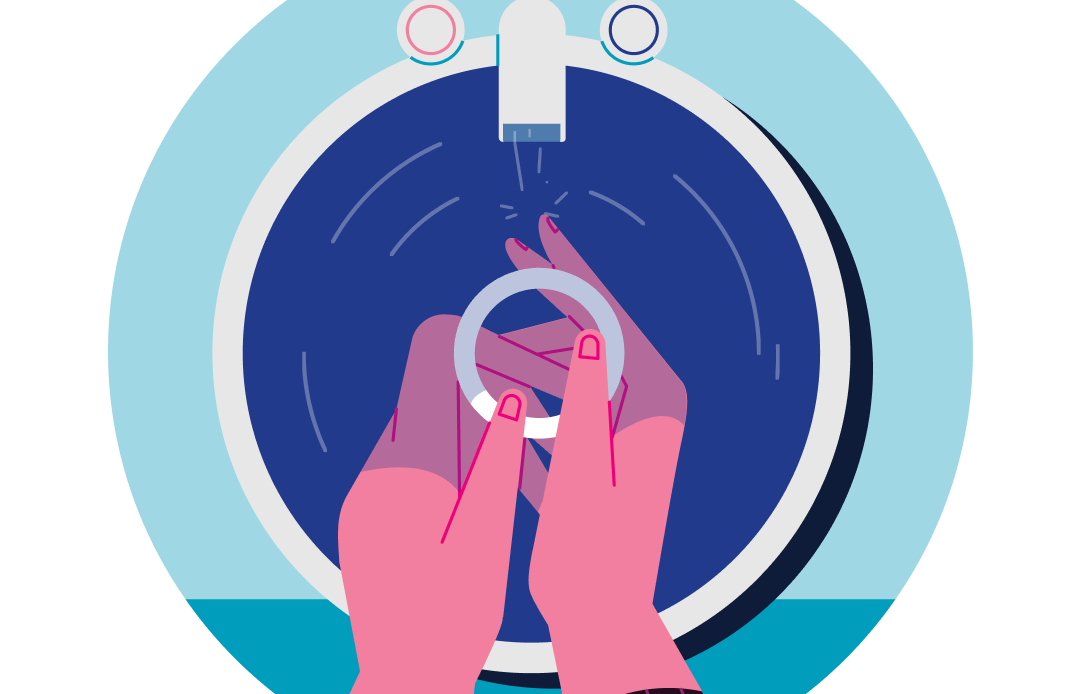 Wash and dry your hands and assume a comfortable position like you did in step 3. Then reach into your vagina, hook the ring with your index finger as shown here, and pull downward and forward to remove it. Wash the ring with mild soap and lukewarm water and pat it dry with a clean paper towel or cloth, and store it in the case provided. Store ANNOVERA away from children, pets and extreme temperatures.
